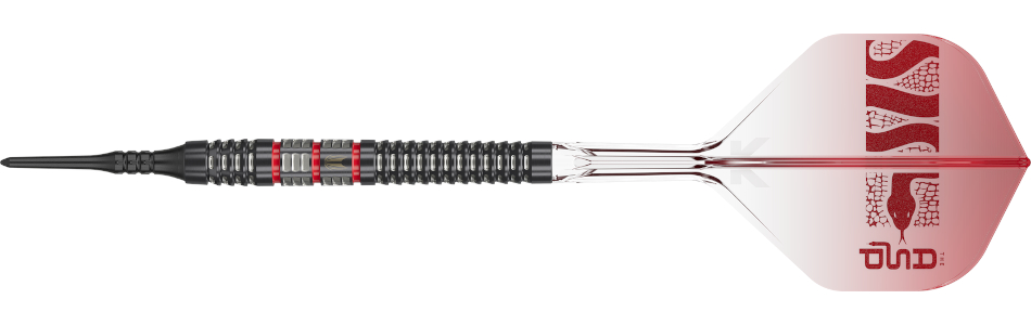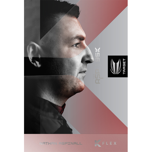 Das Design wird durch exklusive K-Flex No.2 kurzt (19 mm) Flights und Schäfte mit Nathan Aspinalls „The Asp“-Branding abgerundet. Das K-Flex System wird im Präzisions-Spritzgussverfahren hergestellt und integriert Schaft und Flight zu einem einzigen Bauteil. Dies sorgt für erhöhte Haltbarkeit und eine gleichbleibende Flugstabilität im 90-Grad-Winkel. Die transparente rote Lackierung mit dezenten Metallic-Farbverläufen rundet den Look ab und spiegelt Aspinalls typische Energie und sein Selbstvertrauen an der Oche wider.