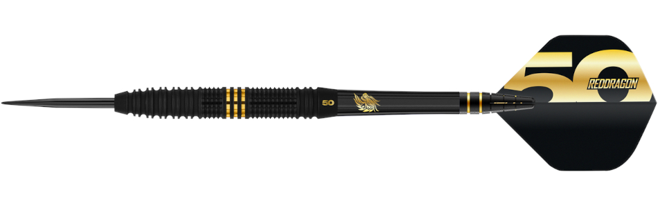 Jonny Clayton – 50-Jahre-Limited-Edition-Dart. Jonny Claytons Wurfstil ist unverwechselbar: schnell, flüssig und unglaublich präzise. Der Dart, der Jonnys Comeback 2025 einleitete, wurde neu interpretiert – mit einem eleganten schwarzen Onyx-Finish und edlen 24-Karat-Verzierungen.