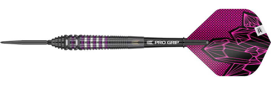 Das konische Profil des Barrels sorgt für einen komfortablen Grip und ein sanftes Abwurfverhalten, während die abwechselnden Rillenbreiten für mehr Kontrolle und Konstanz bei jedem Wurf sorgen. Dieser Barrel, der perfekt zu Lorraines dynamischem Spielstil passt, kombiniert Präzision mit Eleganz. Ausgestattet mit schwarzen, glatten Swiss Points, ermöglichen die Darts ein sauberes Eindringen ins Board mit einem nahtlosen Übergang zur Spitze, um Abpraller zu minimieren. Dank des patentierten Swiss Point Systems können Spieler die Spitzen mit dem mitgelieferten Swiss Tool in Sekundenschnelle wechseln, während die Taper-and-Thread-Technologie sie für Stabilität und Präzision fest fixiert. Abgerundet wird das Design durch Target Pro Grip Schäfte und die speziell angefertigten Pro Ultra No. 2 Flights in auffälligem Pink und Schwarz, die Lorraines unverwechselbare Präsenz am Oche widerspiegeln. Zusammen ergeben sie ein ebenso robustes wie zuverlässiges Setup.
