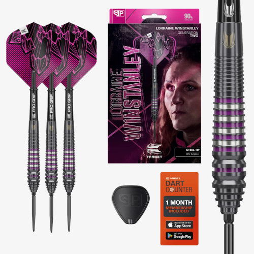 Die in Zusammenarbeit mit Lorraine Winstanley entwickelten Generation 2 Darts sind exakt auf ihre Anforderungen im Wettkampf zugeschnitten. Mit ihrem konischen Barrel aus 90 % Wolfram, eleganten Radialrillen und einer edlen, schwarzen PVD-Beschichtung vereint dieses raffinierte Design Stil und Leistung.