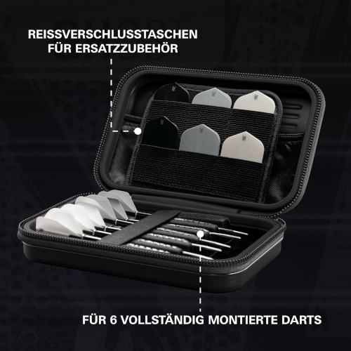 Das Takoma XL besticht durch ein markantes, monochromatisches Design mit auffälligen gelben Akzenten, das Lukes mitreißende Energie und seine furchtlose Präsenz am Oche perfekt widerspiegelt. Sein Name und seine Unterschrift sind dezent in das Muster eingeprägt und verleihen dem Wallet ein elegantes und unverwechselbares Finish, das seinen selbstbewussten, zukunftsweisenden Stil unterstreicht. Dank der robusten Hartschalenkonstruktion des Takoma XL sind Ihre Darts sicher und geschützt. Im Inneren bietet ein kratzfestes Futter sicheren Platz für 6 vollständig montierte Darts, während die erweiterte Aufteilung reichlich Raum für zusätzliche Flights, Schäfte, Swiss Points und Ihr Swiss Point Tool bietet – erstklassiges Design, mehr Stauraum und zuverlässigen Schutz in einem Elite-Etui.