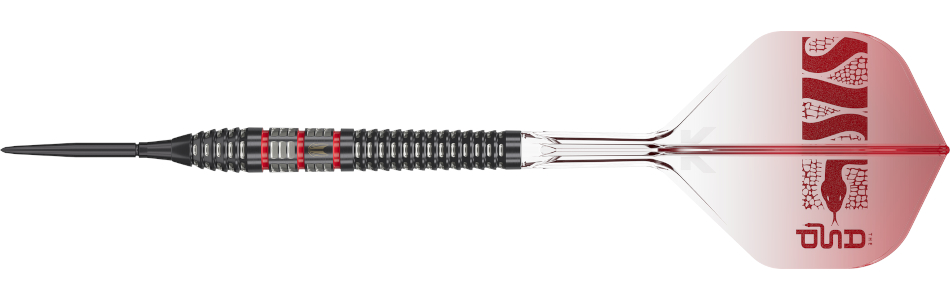 Completing the design are exclusive K-Flex No.2 short (19mm) flights and shafts, featuring Nathan Aspinall’s “The Asp” branding. Manufactured using precision injection moulding, the K-Flex system integrates the shaft and flight into a single component for enhanced durability and consistent 90-degree flight stability. The transparent red finish with subtle metallic gradients completes the look, reflecting Aspinall’s trademark energy and confidence on the oche.
